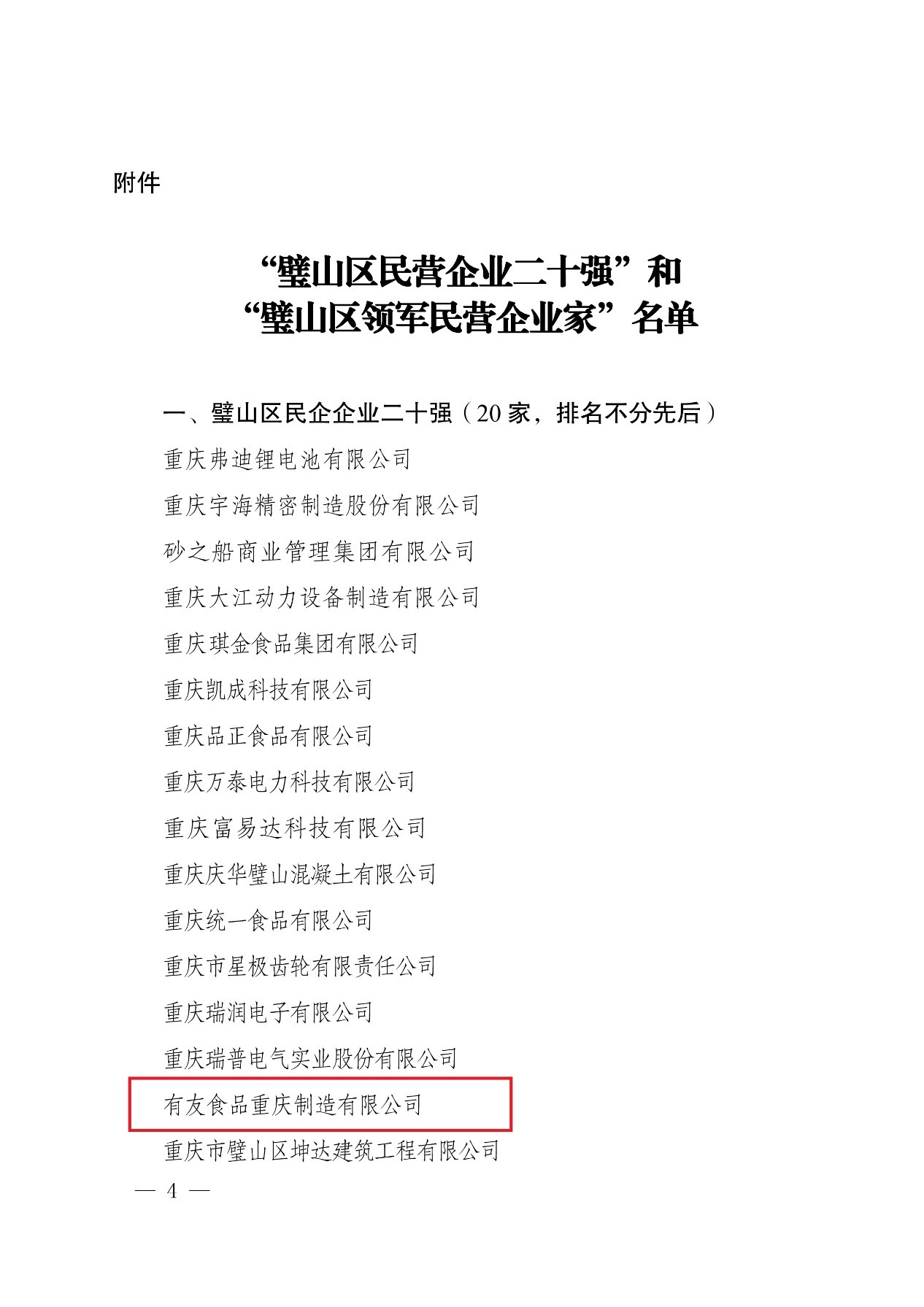 有友食品获璧山区民营企业二十强荣誉称号